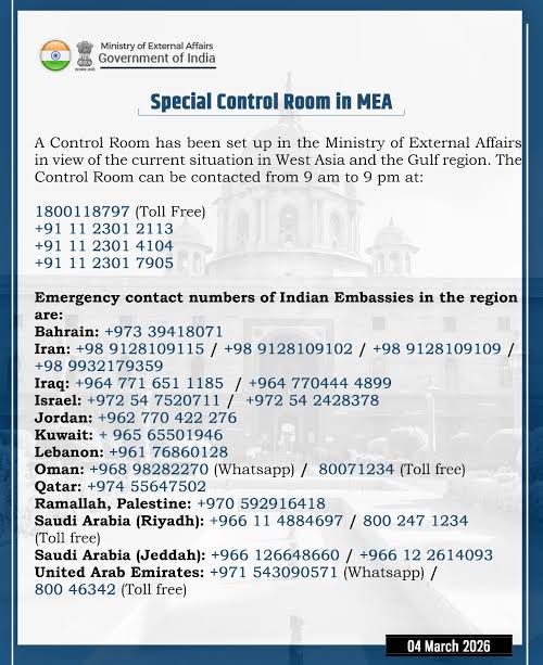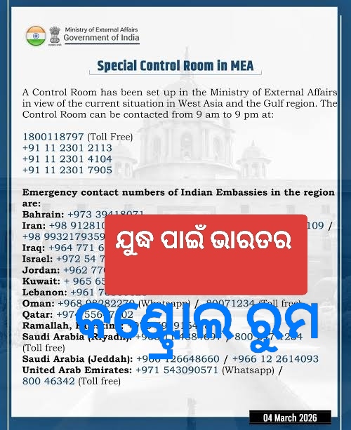 ମଧ୍ୟପ୍ରାଚ୍ୟରେ ଯୁଦ୍ଧ ବିଭୀଷିକାକୁ ଦୃଷ୍ଟିରେ ରଖି, ଭାରତୀୟ ବୈଦେଶିକ ବ୍ୟାପାର ମନ୍ତ୍ରଣାଳୟ ପକ୍ଷରୁ ବିଭିନ୍ନ ଦେଶ ପାଇଁ ନିୟନ୍ତ୍ରଣ କକ୍ଷ ସ୍ଥାପନ କରାଯାଇଛି।